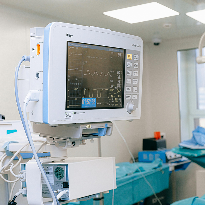Patient Monitoring Systems: Bedside monitors displaying vital signs (heart rate, SpO2, blood pressure).